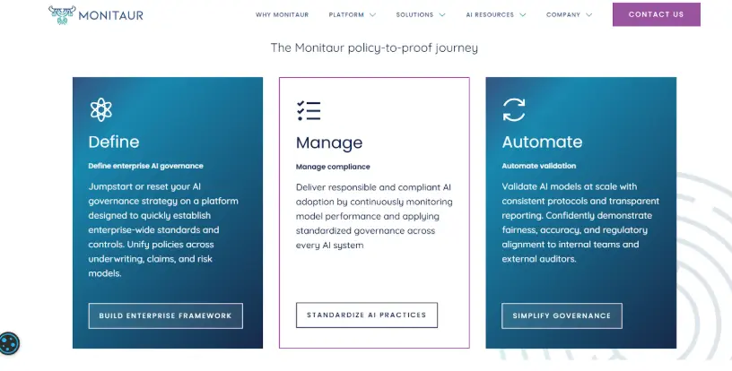 Monitaur focuses on model governance, helping organisations move from high-level AI policies to day-to-day practice. It offers a policy to provide a roadmap that ties governance frameworks to concrete controls, model validation, and monitoring.