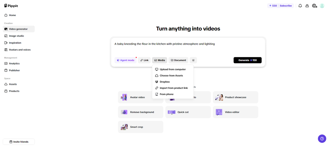 Step 1: Begin with your brand material Access Pippit and signup. Go to the “Video generator” tab and write your text prompt describing your campaign clip. To stay consistent with branding, use the “Add media” tab to upload files from your device, phone, Dropbox, or link. Or pick assets if you lack visuals. Once your setup is complete, click the “Generate” tab.