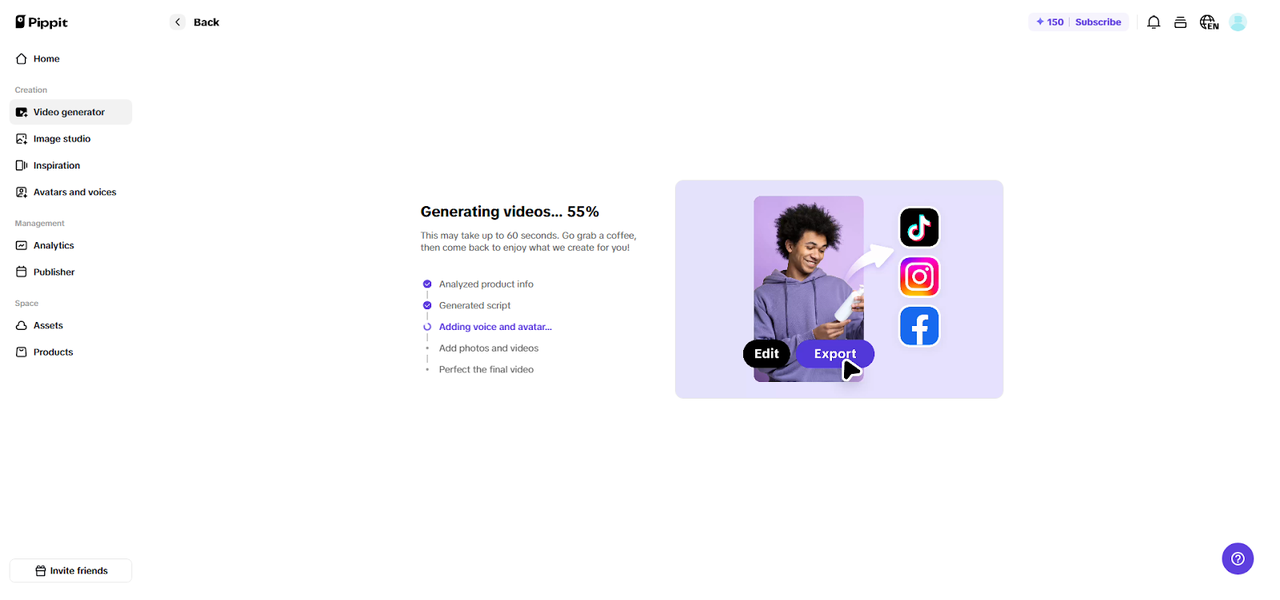 Step 2: Let AI craft your marketing clip The AI video generator in Pippit creates your video based on what you provide and the uploaded content. It addresses pacing, transitions, and polishing details. It is also able to automatically add avatars, captions, lyrics, voice and images or video. Once generated, click edit more, and then you can edit your content in the editor.
