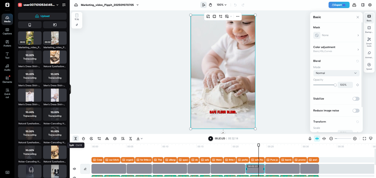 Step 3: Trim into short marketing cuts Use the slider to mark the point where you want to shorten content. Hit the “][” split tab to create smaller clips, then delete unwanted sections.