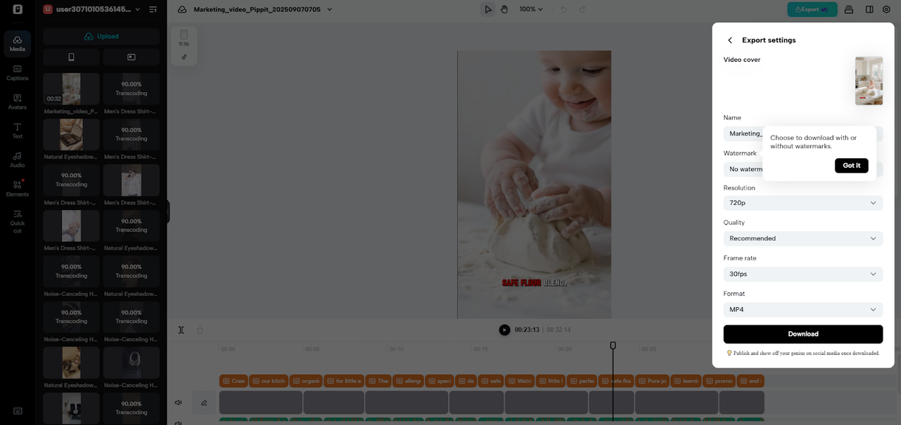 Next, tweak captions, fonts, or colors, and add effects, background music, or filters to match your brand. When satisfied, click the “Export” tab. Share directly using “Publish,” or store your clip using the “Download” tab with your selected settings.